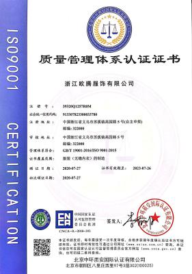 浙江歐騰服飾有限公司位于世界小商品之都-義烏。創立于2015年,是一家專業生產無縫針織運動服飾和內衣的工貿一體企業,擁有自主出口權。 工廠的占地面積約16000平方米 ,引進了大型圣東尼、高騰等多種先進的制衣設備300余臺。月產能可達90萬件。 歐騰服飾每年投入近百萬資金打樣開發新產品,有著一支高素質設計、技術員工隊伍。工廠先后通過了ISO 9001質量管理體系認證、BSCI認證、GRS認證、OEKO-TEX國際生態紡織品認證等多項專利檢測報告。可提供OEM&ODM服務。歐騰服飾以一套完整、科學的質量管理體系,生產的服裝從原材料紗線到成衣,質量完全能夠滿足國內、國際質量要求。獲得了客戶一致好評。工廠先后獲得省科技型企業、國家高新企業、義烏市誠信講信用單位、規上企業、信用AAA級等榮譽。